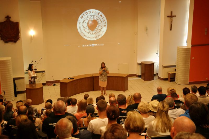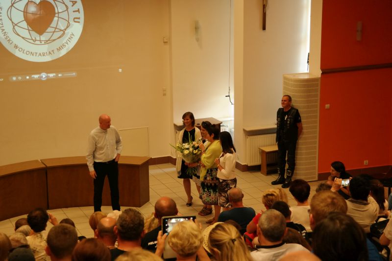 Po Mszy Świętej zebraliśmy się w auli, gdzie Ania Matejko, wolontariuszka, która miesiąc temu wróciła z San Lorenzo (Peru) podzieliła się z nami swoim świadectwem wiary i rocznej pracy na misjach. Mieliśmy też okazję obejrzeć film prezentujący owoce naszych wspólnych działań na rzecz misji. Zdjęcia przedstawiające wolontariuszy na misjach, pracujących w Wioskach Świata przeplatały się z twarzami ludzi, których życie odmieniliśmy naszą postawą i otwartym sercem.
