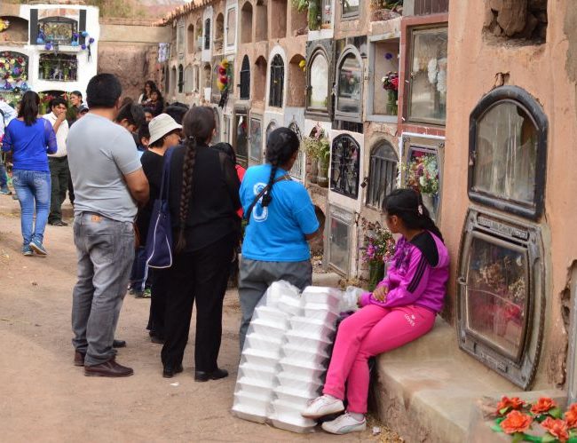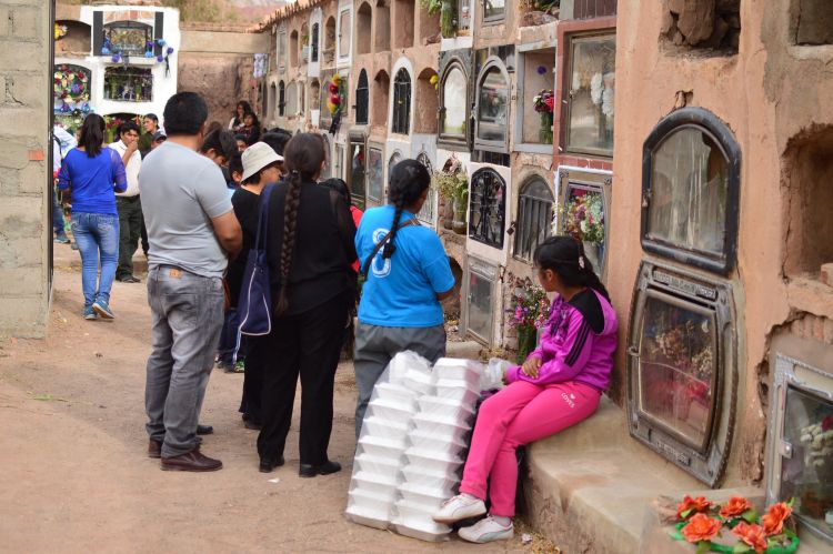 A później nadszedł 2 listopada – dzień Wszystkich Zmarłych. I rzeczywiście byliśmy na cmentarzu. Też są groby, też są kwiaty. Nie ma zniczy, za to jest jedzenie. Na grobach nie widziałam wiele, ale normalne jest, że ludzie jedzą przy grobach. I koka jest, dla zmarłych też. Spacerowaliśmy z Siostrą i dziećmi po cmentarzu odmawiając różaniec. Czasem zatrzymywaliśmy się, czasem ktoś nas wołał, aby pomodlić się przy grobie jego rodziny, i czasem za te modlitwy otrzymywaliśmy ciastka. Na cmentarzu dało się słyszeć instrumenty, śpiewy dla zmarłych, modlitwy, bardzo dużo ludzi. Są groby takie jak u nas, ale są też zupełnie inne. Inność, zupełna inność tych świąt.