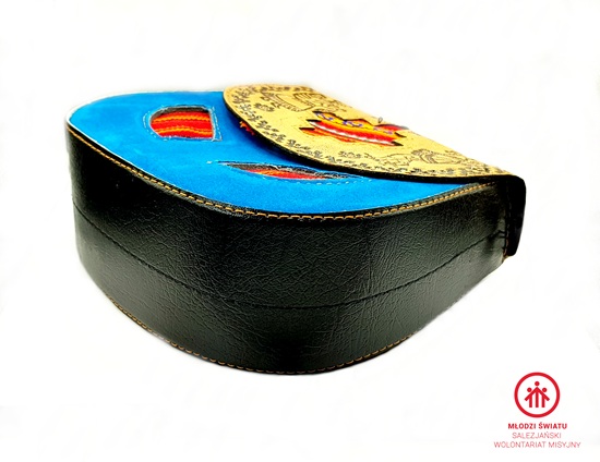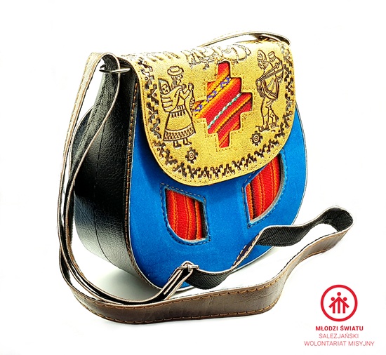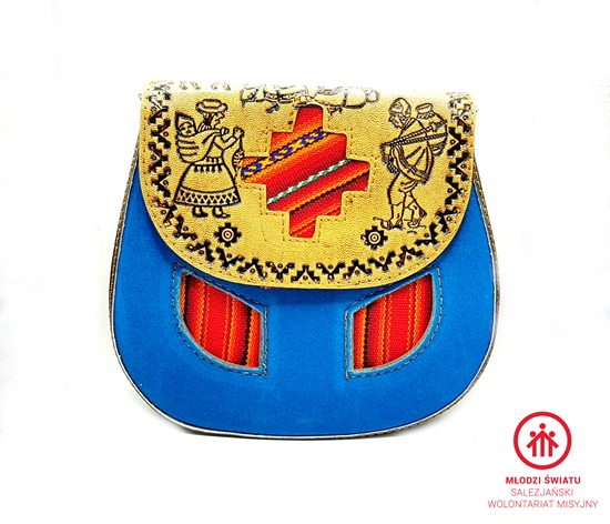 Torebka ze sztucznej skóry i dodatkiem manty wykonana w stylu etnicznym. Posiada wiele rysunków przedstawiających życie mieszkańców Peru.