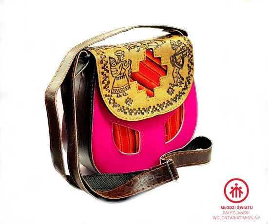 Torebka ze sztucznej skóry i dodatkiem manty wykonana w stylu etnicznym. Posiada wiele rysunków przedstawiających życie mieszkańców Peru.