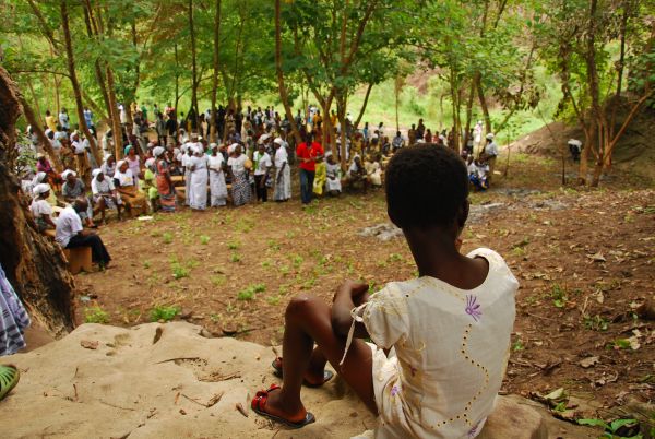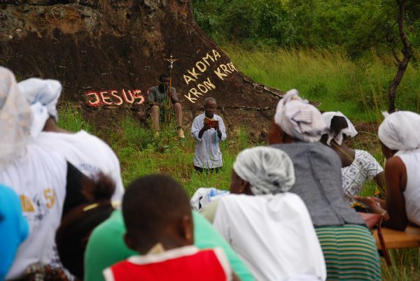 Jema to miejscowość położona w malowniczej okolicy, z czego korzystali również organizatorzy obozu. W czasie piątkowego przedpołudnia wzięłaś aparat w dłonie i popędziłaś niczym ghański tygrys lub żyrafa w stronę buszu, albo to the bush is comming? Razem z całą grupą obozowiczów i mieszkańcami, z ławkami na głowach, różańcami w dłoniach, modlitwą na ustach, zmęczeniem w stopach przemieniliśmy skałki w sanktuarium modlitwy. Bo przecież, gdzie dwóch albo trzech się spotyka..? Tak.