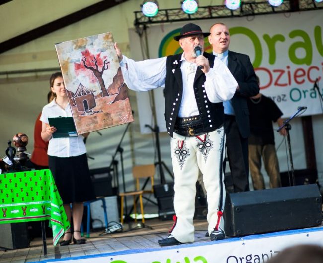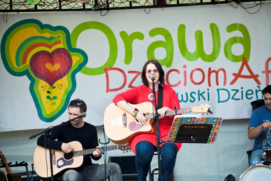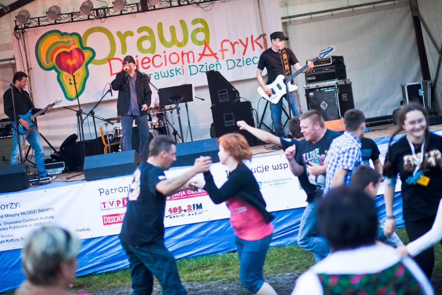 Po południu, na stadionie w Jabłonce, rozpoczął się wielki, rodzinny festyn, pełen muzycznych, artystycznych i kulinarnych atrakcji. Przybyłych licznie Orawian i gości przywitali Jadwiga Karlak, rodowita Orawianka, wolontariuszka SWM i pomysłodawczyni całego przedsięwzięcia, oraz ks. Andrzej Gołębiowski – prawdziwy salezjański showman. Imprezę zainaugurował występ zespołu „Małe Podhale”, który dostarczył wszystkim zebranym prawdziwej dawki barwnego i unikalnego orawskiego folkloru. Kilkudziesięciu młodych tancerzy w góralskich strojach zaprezentowało swoje imponujące taneczne i wokalne umiejętności. Emocji towarzyszących występowi nie ostudziło nawet oberwanie chmury i gradobicie, które przetoczyło się nad stadionem w Jabłonce. Chwilę potem, gdy słońce z powrotem wyjrzało zza chmur, na scenie pojawił się gość specjalny jubileuszowej imprezy – Dorota Segda. Znana aktorka teatralna i filmowa od kilku lat jest ambasadorką Adopcji Miłości w Salezjańskim Wolontariacie Misyjnym. Pięć lat temu zapragnęła czynnie włączyć się w działania na rzecz misji i wyjechała wraz z innymi wolontariuszami SWM do Malawi, gdzie pracowała z miejscowymi nauczycielami. Tym razem przybyła na Orawę, by poprzez swoją obecność i świadectwo misyjne promować działania na rzecz pomocy Afryce. Z jej rąk otrzymali nagrody wszyscy młodzi laureaci konkursów ogłoszonych wcześniej w orawskich szkołach. Zaraz potem rozpoczął się jeden z najbardziej emocjonujących momentów festynu, czyli aukcja afrykańskich eksponatów. Licytowanie dzieł sztuki afrykańskiej, przywiezionych do Polski przez wolontariuszy i misjonarzy to już tradycja, bez której nie mogłaby odbyć się „Orawa Dzieciom Afryki”. Pod młotek poszły oryginalne eksponaty z dalekich krajów misyjnych, m.in. globus obrotowy z Ghany, szachy z Zambii, peruwiański wazon oraz wyjątkowy obraz przedstawiający architekturę skansenu w Zubrzycy Górnej.
