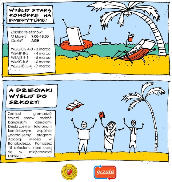 Zmieniałeś ostatnio starą komórkę? Zepsuł Ci się telefon? Możesz jeszcze zrobić użytek z zepsutego sprzętu. Wystarczy, że początkiem marca przyniesiesz go na AGH. Zamiast gromadzić śmieci spraw radość dzieciom z Bangladeszu!