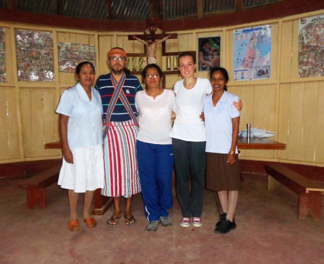 Pobudka o 5:30. O 6 mamy Mszę w kaplicy. Msza w stylu indian odbywa się… na siedząco. Od początku do końca. A to dlatego, że w ich mentalności o sprawach ważnych i bardzo ważnych można mówić tylko na siedząco. Jeśli stoisz, jest to znak, że jesteś przez coś poganiany, nie masz czasu na rozmowę. lub nie traktujesz rozmówcy poważnie. Ksiądz Diego ma przepasany na biodrach itíp – tradycyjną tkaninę indiańską (wygląda jak długa spódnica), takąż stułę i opaskę na czole. Promienie wschodzącego słońca powoli wślizgują się do środka. Za oknami – błyszczące długie liście bananowca, powietrze rześkie, jeszcze nie przyszedł żar dnia, słychać trele budzących się ptaków. Jest spokojnie, wnętrze sprawia wrażenie przestrzeni, a jednocześnie przytulności domu. Próbowałam napisać, jak się czułam w tym momencie, ale nie mogę dobrać właściwych słów. Po prostu Dobrze.