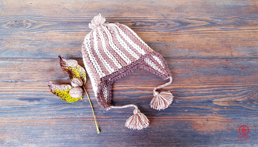Rozmiar niemowlęcy : 6 – 9 miesięcy. Wysokość 19cm od pompona do czoła (z nausznikami 27 cm; z warkoczykami 40 cm) ,szerokość dołu 22 cm, lekko się rozciąga