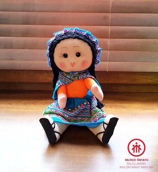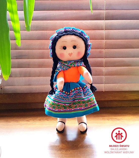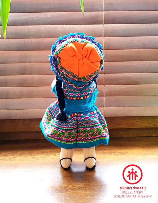 Lalka szmaciana z manty peruwiańskiej pochodzi z okolic Cusco w Peru. Lalka ma długie warkocze wykonane z wełny. Jej ubrania (kapelusz oraz sukienka) zostały uszyte z tkanego, tradycyjnego peruwiańskiego materiału charakterystycznego dla Ameryki Południowej.