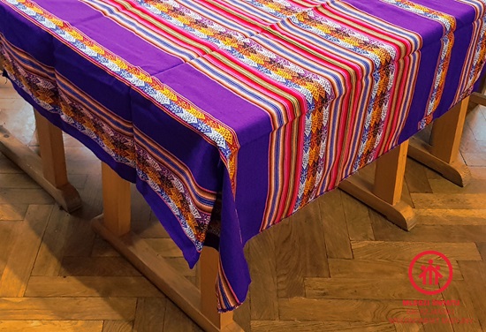 Obrus wykonany z charakterystycznej dla regionu południowoamerykańskiego tkaniny zwanej aguayo. Unikatowa ozdoba.