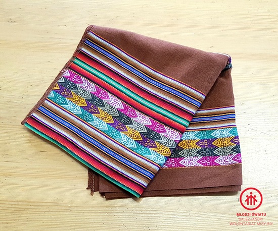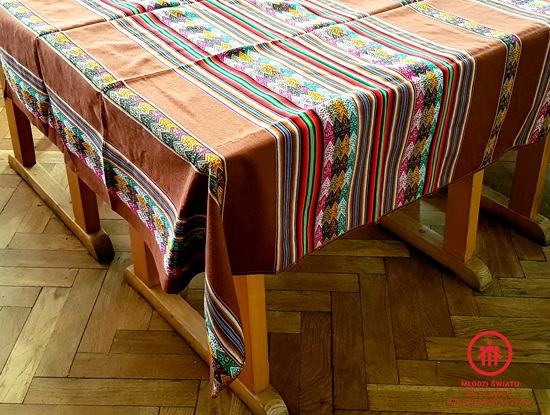 Obrus wykonany z charakterystycznej dla regionu południowoamerykańskiego tkaniny zwanej aguayo. Unikatowa ozdoba.