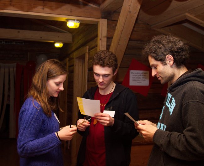 Rozpoczęliśmy spotkanie od wspólnej Eucharystii. Posileni duchowo, ze słowami „Effatha!” (hebr. „Otwórz się!”) w myślach i sercach, udaliśmy się na kolację, po której przyszedł czas na poznawanie się. Kto jest dla ciebie inspiracją? Jaką ksywkę miałeś w dzieciństwie? Do jakiego roku przeniósłbyś się, gdybyś mógł podróżować w czasie? Tych i innych ciekawych rzeczy o współuczestnikach zjazdu dowiadywaliśmy się w czasie integracji. Pracowaliśmy też na sobotnie zakwasy w skocznej peruwiańskiej zabawie „Buty na sprzedaż”. Pierwszy dzień zakończyliśmy spokojnie, oglądając film pt. „Zmartwychwstały”.