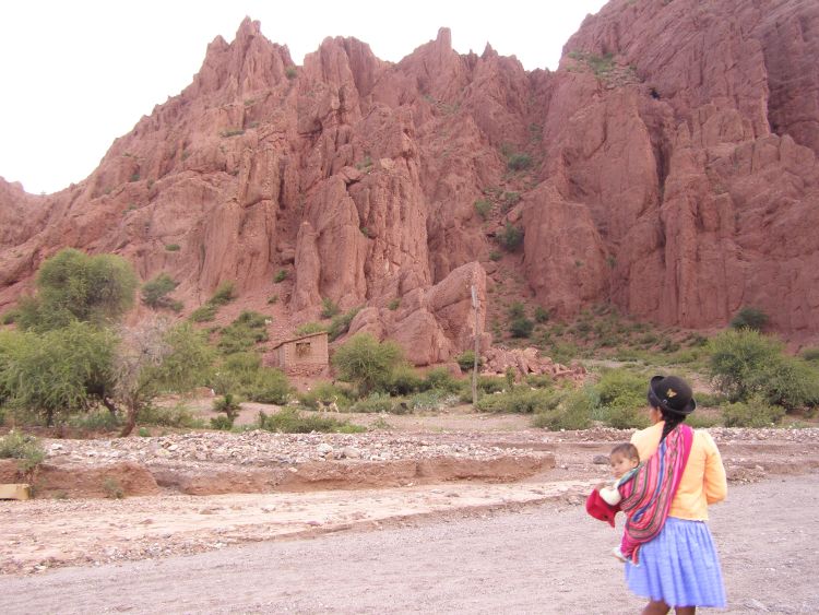 A przed chwila minelyśmy znak drogowy „UWAGA NA LAMY”, wokoł skaly we wszelkich mozliwych odmianach czerwieni, gdzieniegdzie snieg, pomiedzy jedynie blisko ziemi wystepujacymi zoltozielonymi trawami i niziutkimi krzaczkami. Na scianach skalnych co rusz wymalowane na przemian napisy przypominajace o milosci Chrystusa lub wychwalajace Evo Moralesa. Asfalt jest porzadny, choć wzdluz ciagnacych sie nieustannie boliwijskich serpentynowych dróg co chwila przydrozne krzyze i male kapliczki oznaczaja miejsca, gdzie w wypadkach zgineli ludzie. Szerokie koryto rzeki całkowicie wyschniete, musi się niesamowicie zmieniac w porze deszczowej.